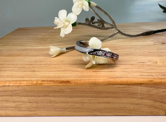 Gorgeous slightly curved keepsake band! Band slightly curved, it is not a straight ring. Channel with the inclusion spot goes half way around the band, so it does not wrap around on the back. Will stack with other rings. Ring has spots around the curve for the birthstones.
